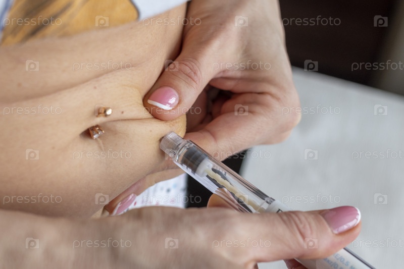 Крупный план женщины с красивыми руками, готовящей гормональные лекарства и делающей себе инъекцию в живот с проколотым пупком. Здравоохранение
