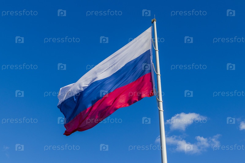 Крупный план российского флага, развевающегося на ветру. Страна