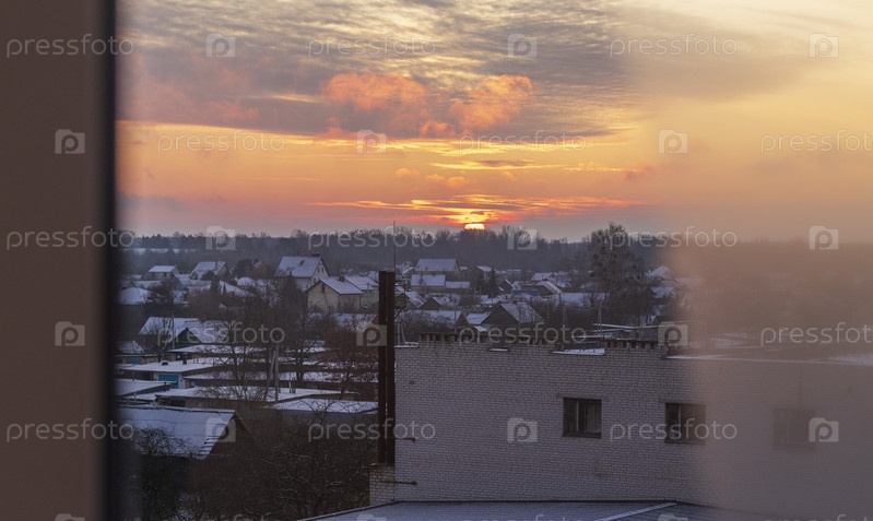 Снимок драматического заката в сельском городе холодным утром. Время года