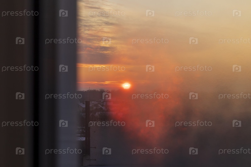 Снимок драматического заката в сельском городе холодным утром. Время года