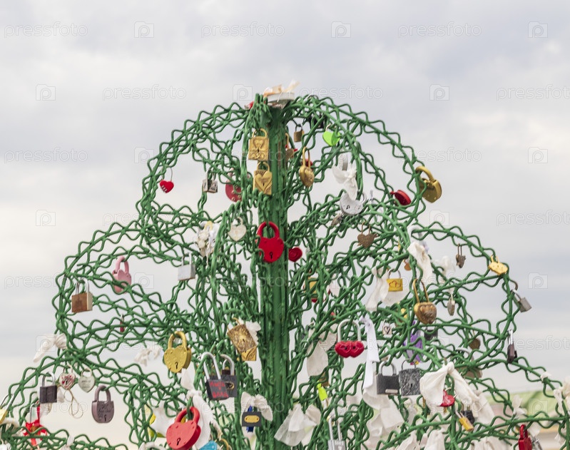 Металлическая древовидная конструкция, где пары запирают замки в знак настоящей любви. Концепция