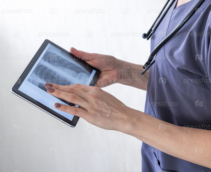 Снимок женщины-врача в форме на фоне белой стены, изучающей рентгеновское изображение легких на планшете. Здравоохранение