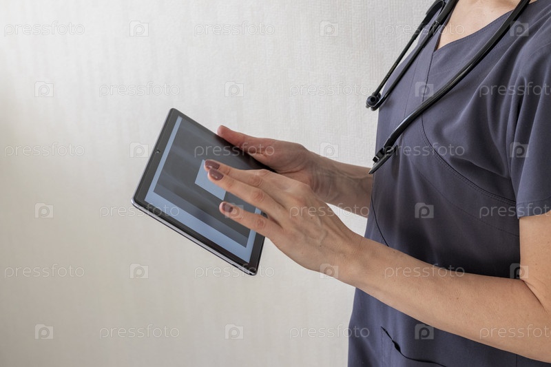 Снимок женщины-врача в форме на фоне белой стены, изучающей рентгеновское изображение легких на планшете. Здравоохранение