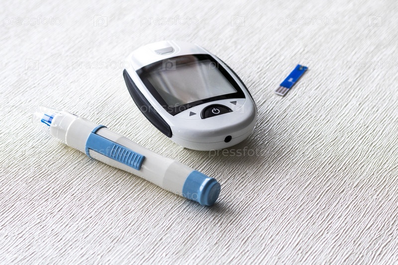 Крупный план глюкометра на белой поверхности. Здравоохранение