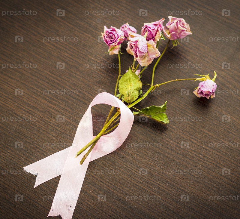 Снимок сухих роз, завернутых в розовую ленту, символ осведомленности о раке молочной железы. Концепция