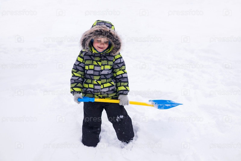 Маленький мальчик играет зимой в снегу