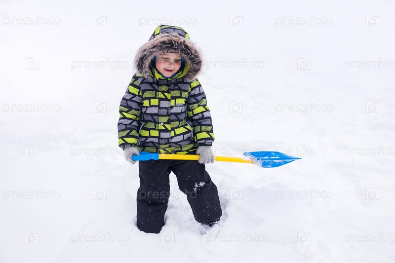 Маленький мальчик играет зимой в снегу