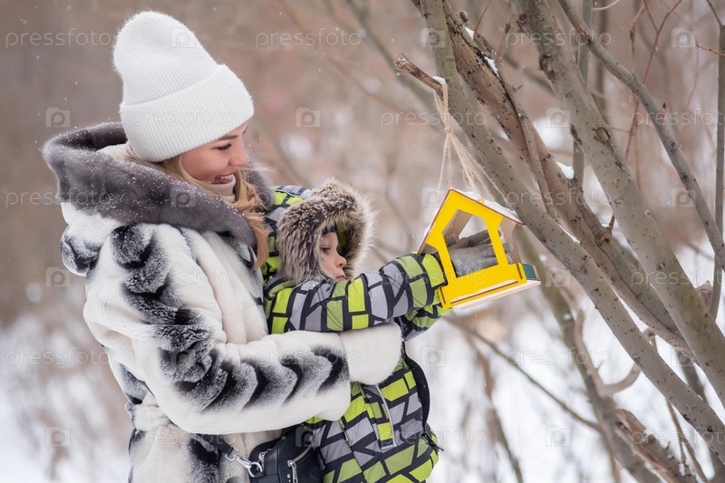 Мать и сын в зимнем парке кормят птиц с помощью кормушки