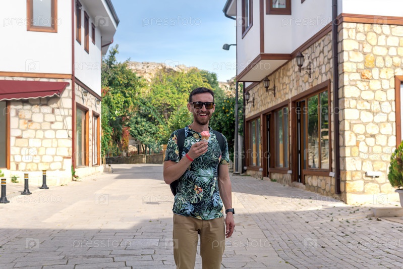 Веселый турист с мороженым в средиземноморском городе