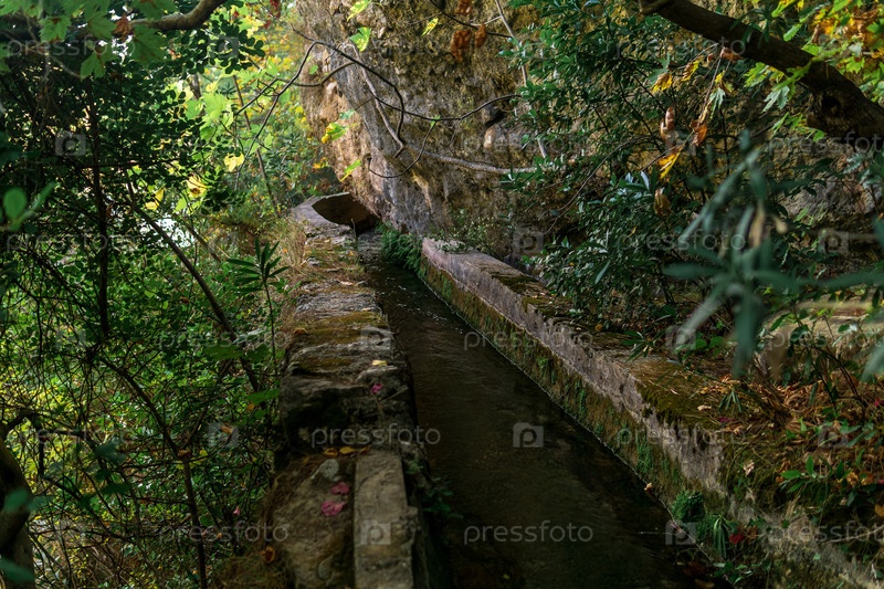 Бетонный оросительный канал под скалой в горной местности