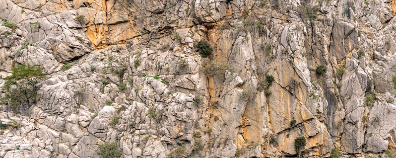 Пейзаж, текстура - отвесная горная скала с трещинами и растительностью