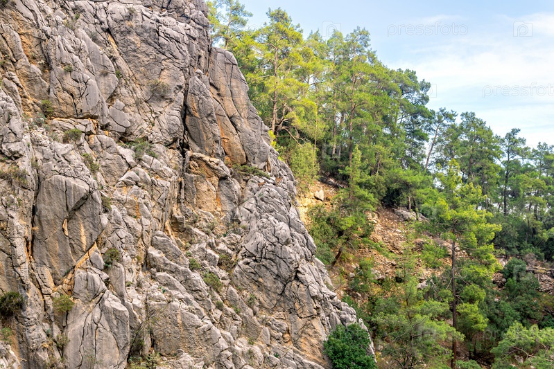 Горный пейзаж - отвесная скала с серной и лесистым склоном