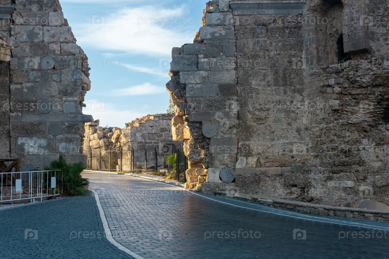 Дорога проходит через древние ворота Веспасиана в Сиде, Турция