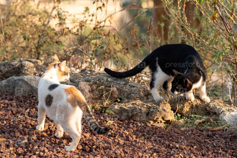 Две бездомные кошки настороженно смотрят друг на друга при встрече