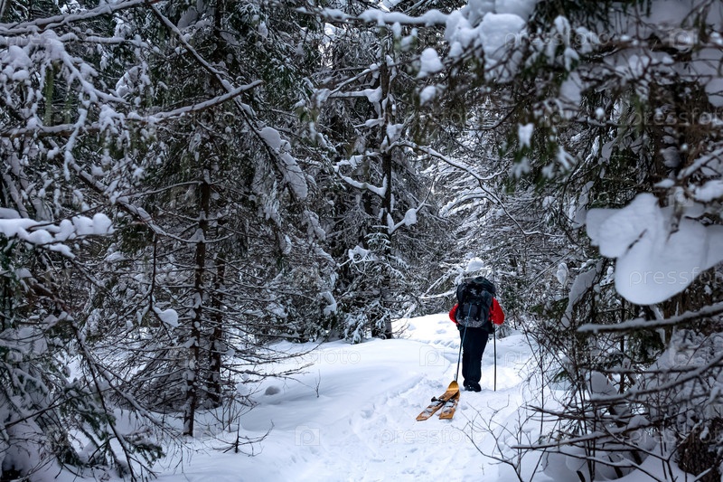 Турист идет по тропинке в зимнем лесу, таща за собой лыжи