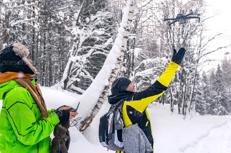Двое мужчин в зимнем лесу запускают квадрокоптер