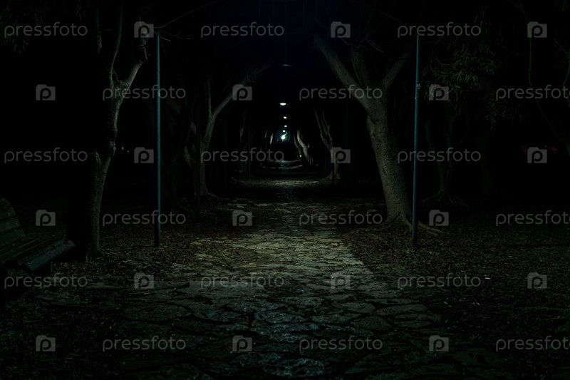Темная аллея в парке, едва освещенная светом редких фонарей