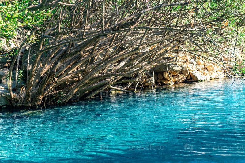 Стволы прибрежных кустов, растущие в прозрачной голубой воде