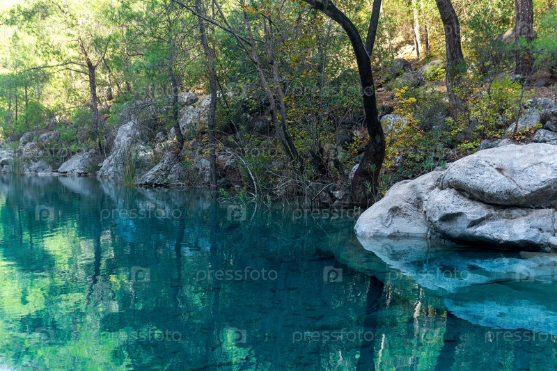 Озеро со спокойной голубой водой в горном осеннем лесу