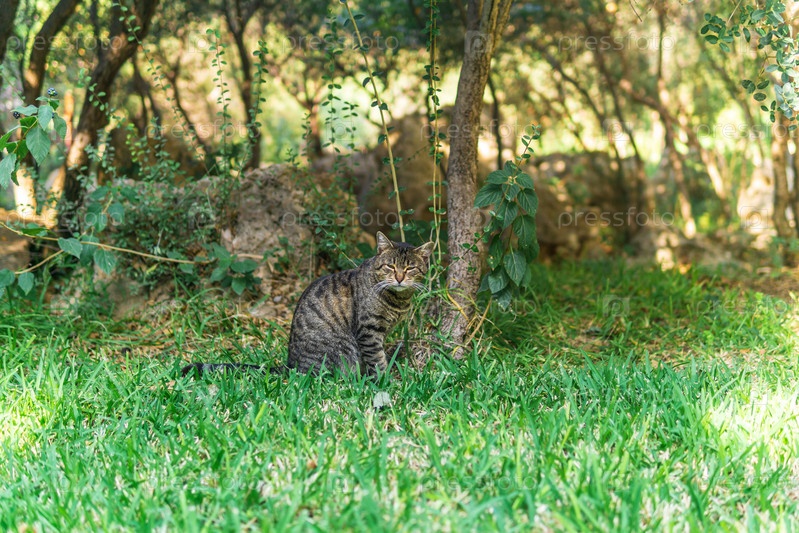 Серый кот среди растительности в парке