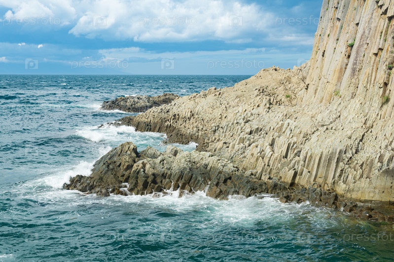 Скалистый берег моря, образованный столбчатым базальтом на фоне морского прибрежного ландшафта Курильских островов