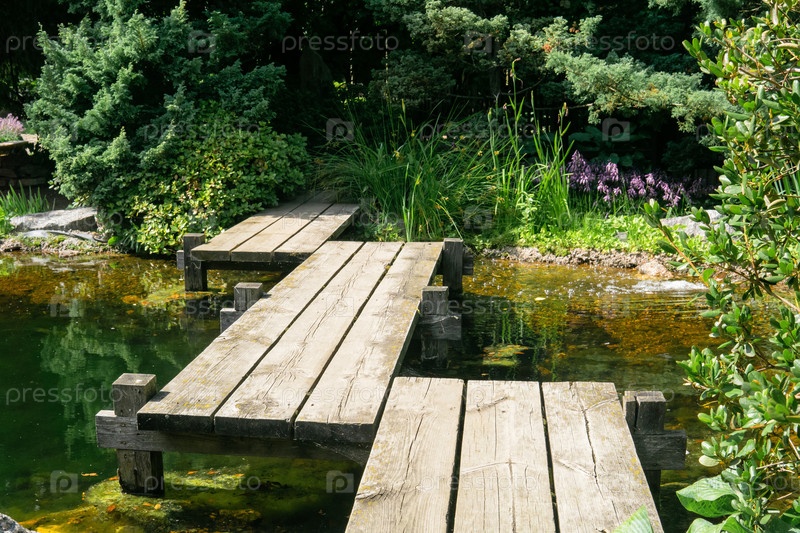 Зигзагообразный мост через пруд в японском саду