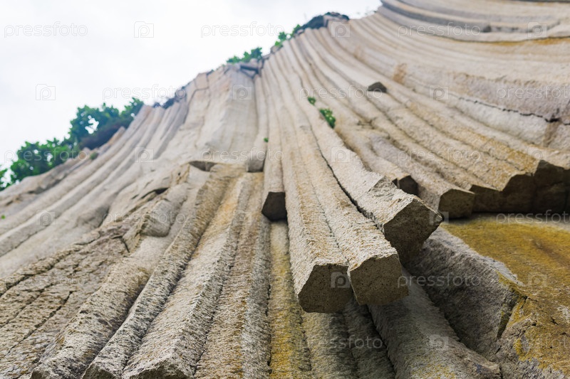 Базальтовые колонны, образующие прибрежную скалу на мысе Столбчатый на острове Кунашир, крупный план