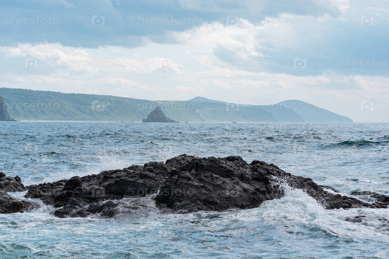 Морской пейзаж с далеким лесистым берегом на заднем плане и скалами в прибое на переднем плане, пейзаж острова Кунашир