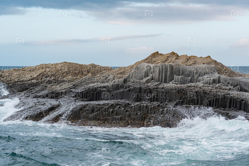 Скалы, состоящие из столбчатого базальта, среди морского прибоя, мыс Столючий на острове Кунашир