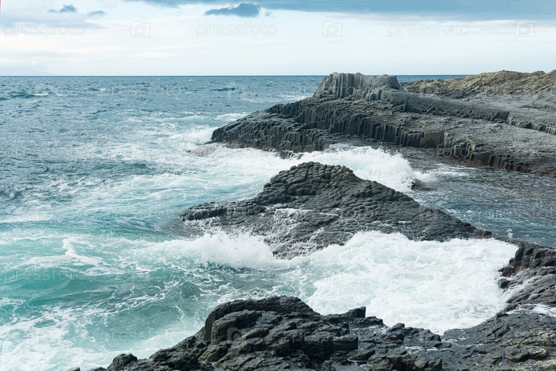 Скалистый берег моря, состоящий из столбчатого базальта на фоне бурного моря, прибрежный ландшафт Курильских островов