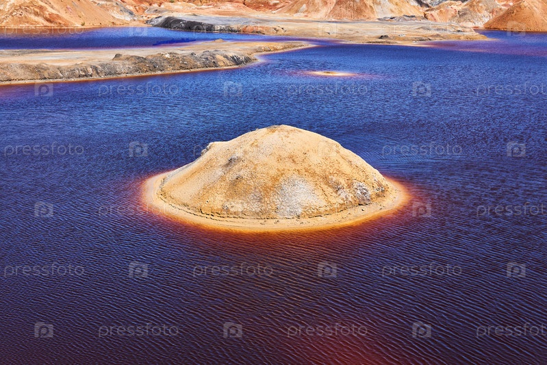 Круглый песчаный остров посреди фиолетового озера в старом каолиновом карьере