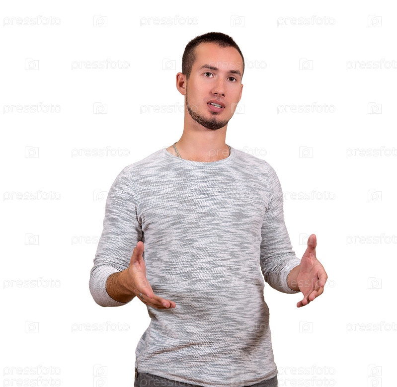 Молодой человек что-то объясняет, изолированный на белом фоне