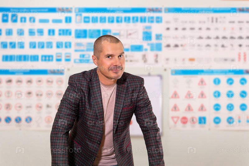 Инструктор по вождению мужчины на размытом фоне тренировочной комнаты с дорожными знаками
