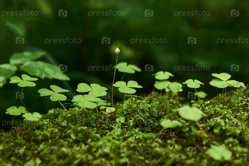 Листья и бутон щавеля, растущие среди мха крупным планом