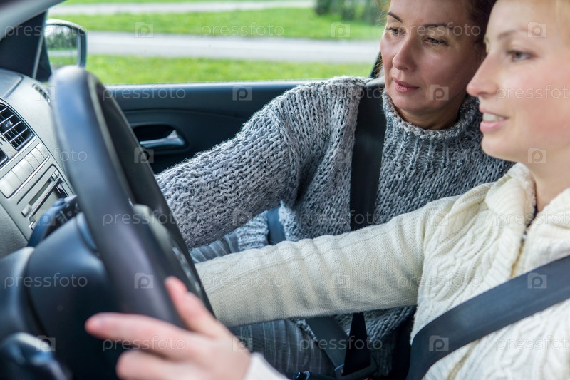 Инструктор по вождению учит студентку водить машину