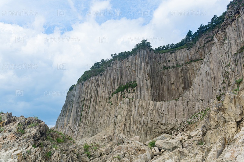 Высокий прибрежный утес, образованный застывшими лавовыми каменными колоннами, мыс Столбчатый на острове Кунашир