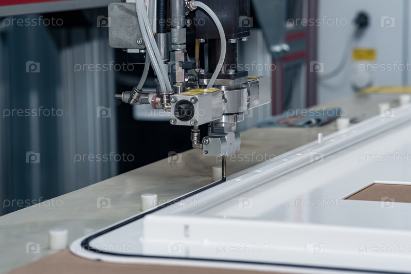 Промышленный роботизированный дозатор наносит затвердевающий герметик на заготовку металлической двери