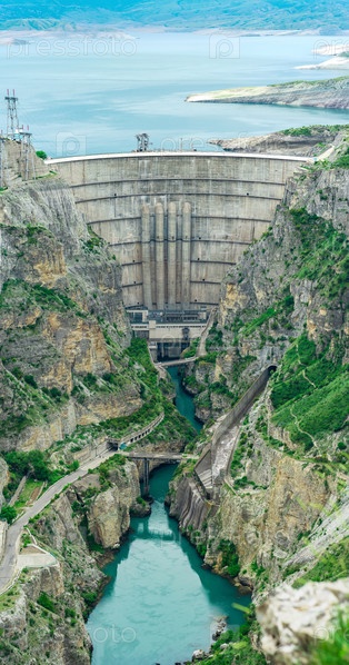 Большая арочная плотина гидроэлектростанции на реке в скалистом каньоне