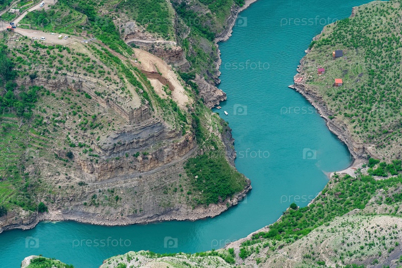 Горный пейзаж с глубоким каньоном с голубой рекой, по которой движется моторная лодка