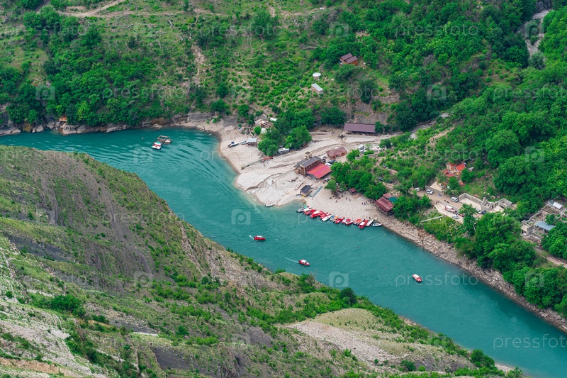 Вид сверху на горную реку Сулак в Дагестане с туристической лодочной базой