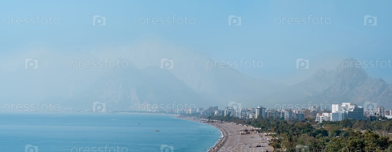 Вид на пляж Коньяалты с близлежащих скал в Анталии, Турция. На заднем плане видны горы Бейдаглари в тумане