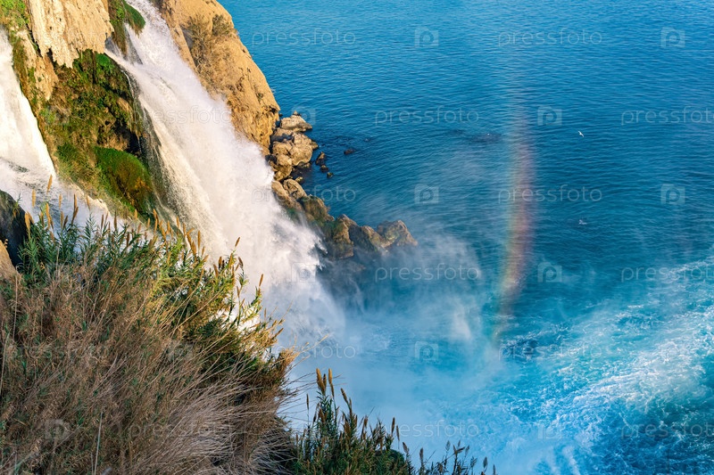 Радуга у подножия водопада, падающего в море со скалы, Нижний Дюден, Анталья