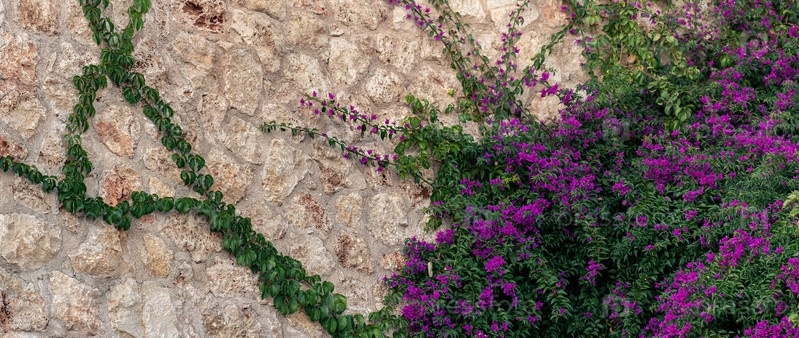 Задний план — старая каменная стена, частично обвитая цветущей лианой мандевиллы