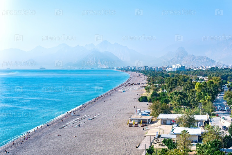 Вид на пляж Коньяалты с близлежащих скал в Анталии, Турция. На заднем плане видны горы Бейдаглари в тумане