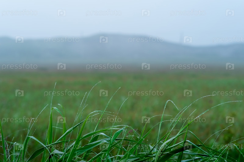 Травинки с каплями росы на фоне размытого туманного утреннего луга
