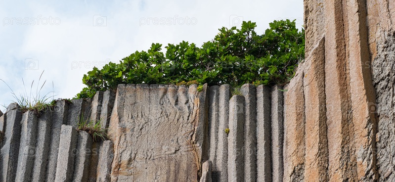 Натуральный столбчатый базальтовый утес с растениями на вершине