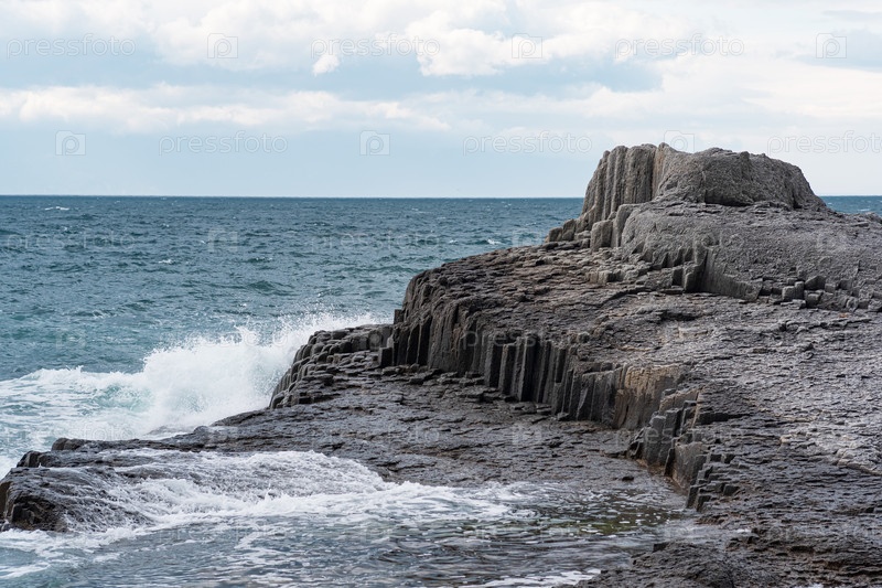 Скалы, образованные столбчатым базальтом среди морского прибоя, мыс Столбчатый на острове Кунашир