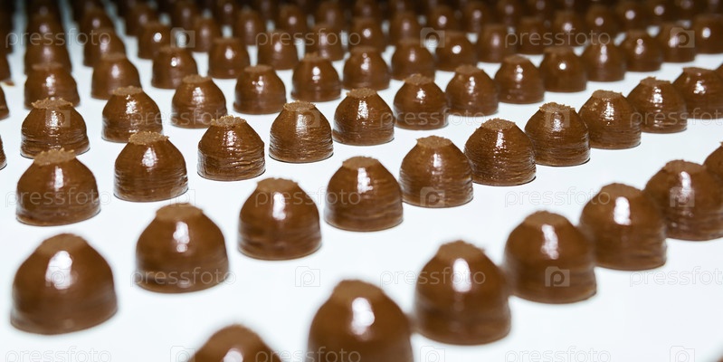Шоколадные начинки на конвейере кондитерской фабрики крупным планом