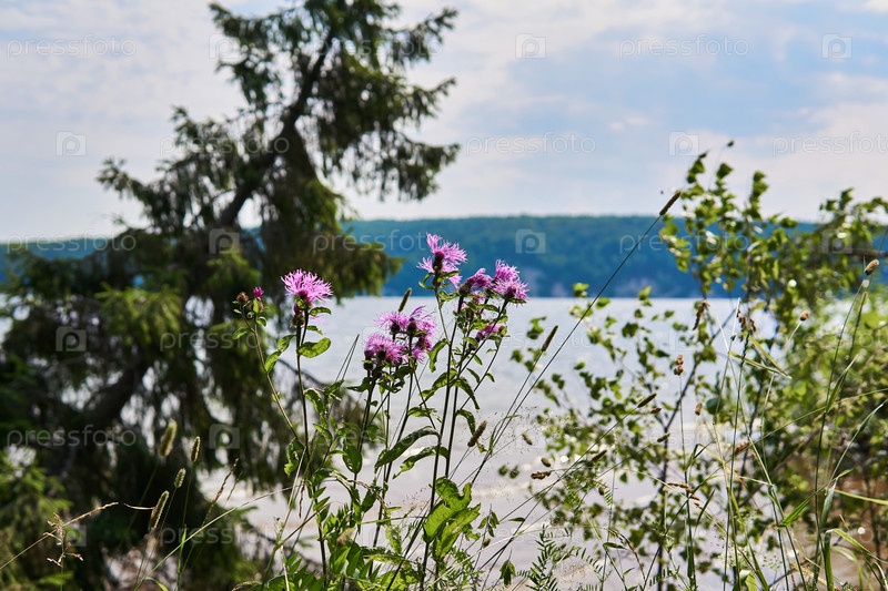 Цветы василька на фоне размытого речного пейзажа