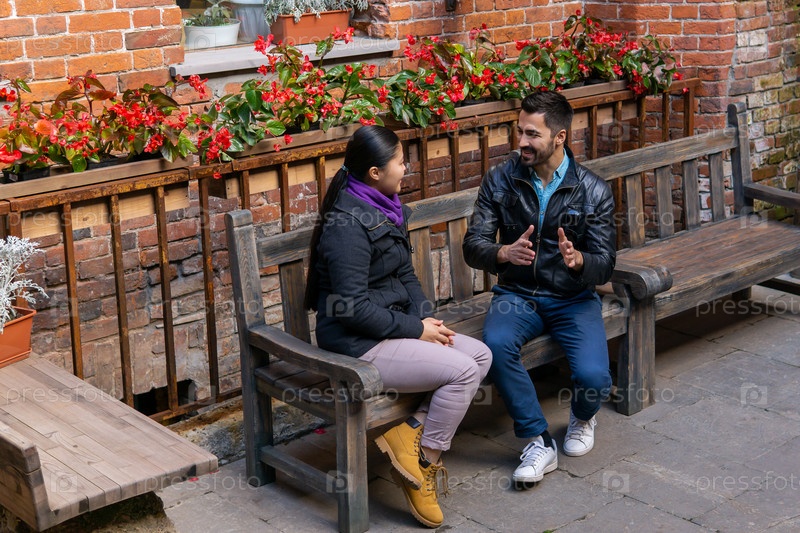 Молодой мужчина и женщина весело обсуждают что-то, сидя на скамейке на открытом воздухе